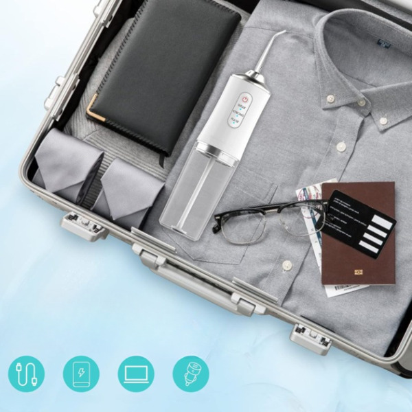 Com um peso de apenas 350g, este irrigador oral portátil cabe facilmente em qualquer mala de viagem.