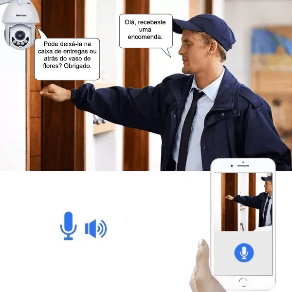 Com o microfone responsivo integrado na câmara de segurança exterior, pode ouvir e falar através da nossa aplicação. O áudio bidirecional permite-lhe comunicar com os seus convidados, enquanto que o alarme de deteção de movimentos o ajuda a livrar-se rapidamente de visitantes ou animais indesejados.