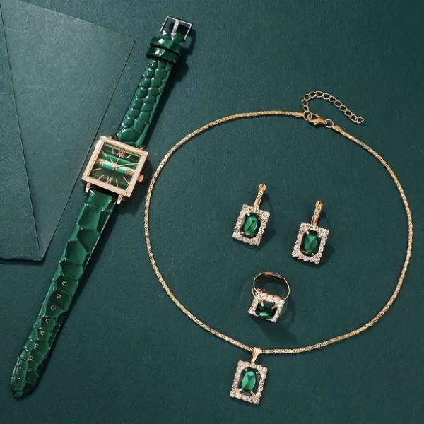 Este conjunto chique apresenta relógios de quartzo de ponteiro quadrado vintage em tons verdes impressionantes, complementados por um deslumbrante conjunto de jóias com strass, permitindo que você eleve seu próprio estilo e compartilhe a elegância com seus entes queridos. 🎁⌚💚