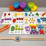 Os pauzinhos e as colheres fortalecem a preensão e a coordenação óculo-manual ao mover e organizar as contas.