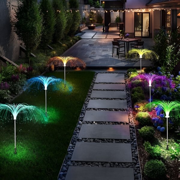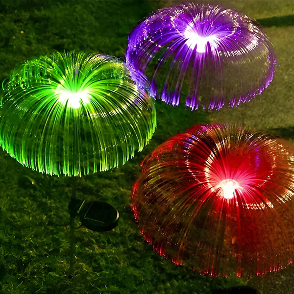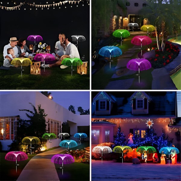 Duplique a beleza do seu jardim à noite! Estas luzes de guarda-chuva vêm com uma haste de perfuração do solo para colocar em qualquer lugar no solo. Coloque-as corretamente e dê vida aos canteiros de flores. O brilho é semelhante a uma medusa e pode alterar entre 7 cores diferentes, fazendo com que o seu jardim floresça com magia.