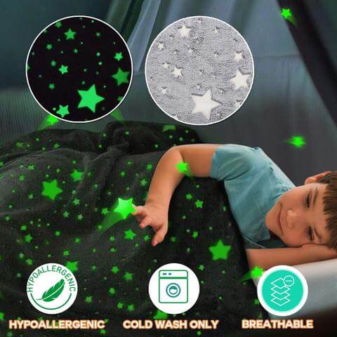 BLANKGLOW! Feito de materiais luminescentes, este cobertor mágico vai levar o seu sono a um nível galáctico! Os materiais luminescentes dão um brilho verde claro e calmante à noite!