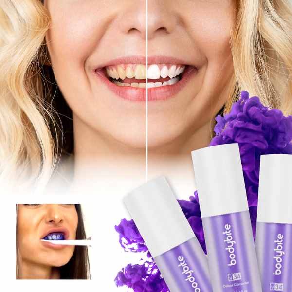 O V34 utiliza tecnologia de correção de cor para melhorar visivelmente o brilho do seu sorriso. Como o roxo é a cor complementar do amarelo, a fórmula ajuda a equilibrar os tons amarelos indesejados para uma aparência mais uniforme e radiante. O resultado é um sorriso com aspeto instantaneamente mais fresco — sem tratamentos agressivos ou passos complicados.